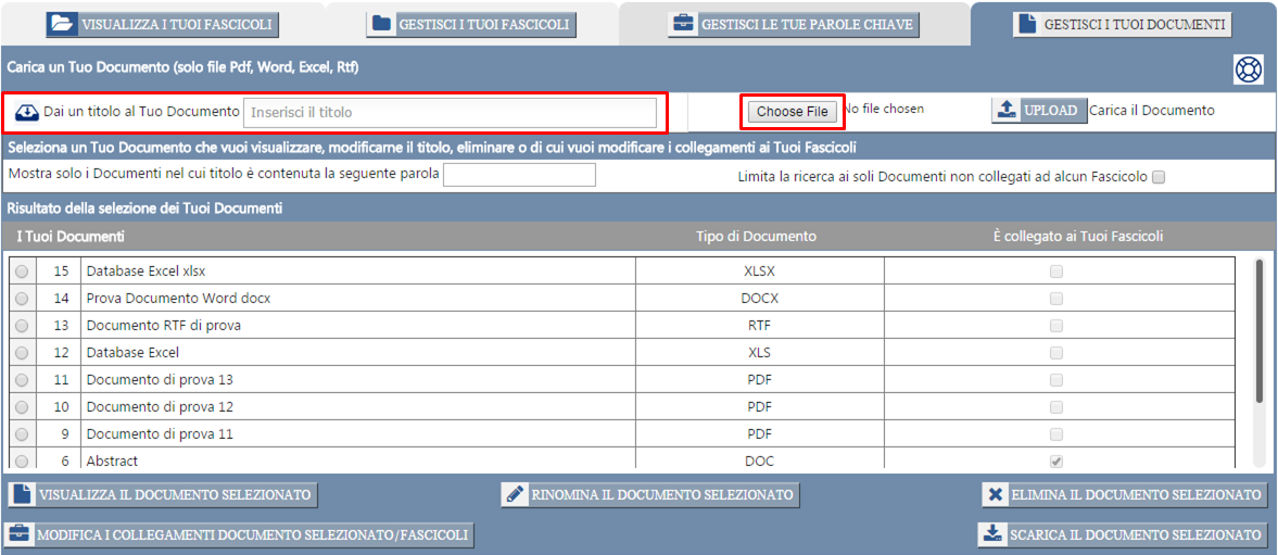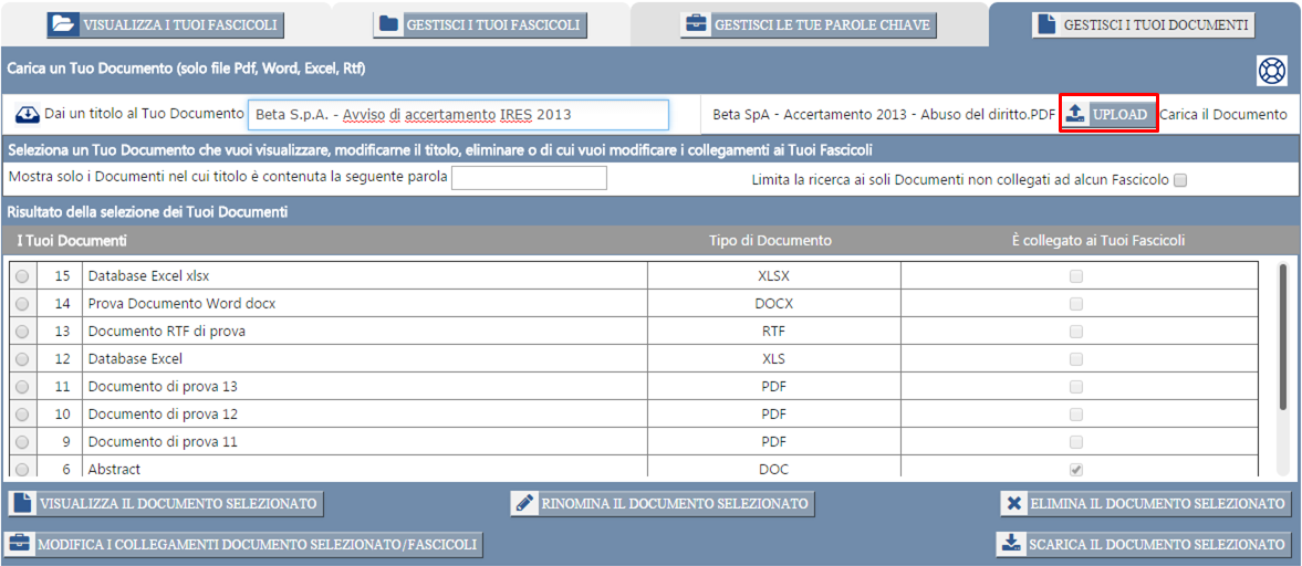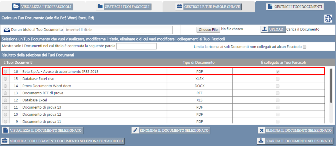 Il documento da Te appena caricato nel sistema risulterà adesso elencato nel database de "I Tuoi documenti".
