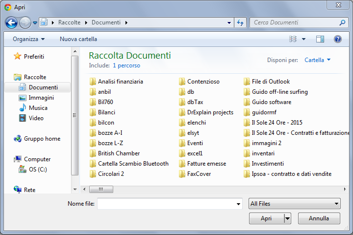 Premuto il pulsante "Choose File" si aprirà la finestra "Esplora risorse" all'interno della quale potrai selezionare il file del documento da caricare nel sistema.