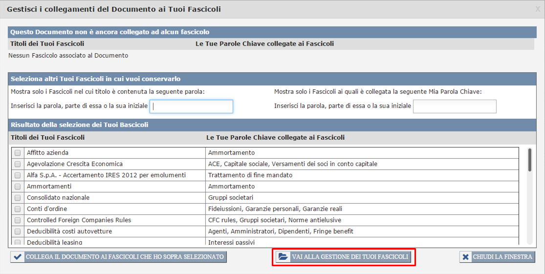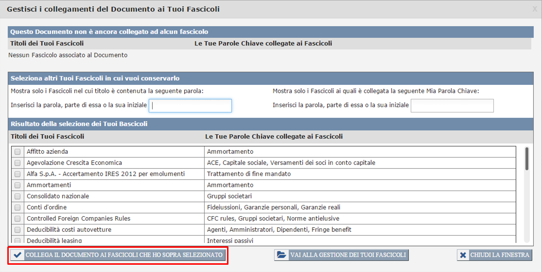 Seleziona i Tuoi Fascicoli in cui vuoi conservarlo" della medesima finestra. Per la procedura da seguire per selezionare un Fascicolo vedi