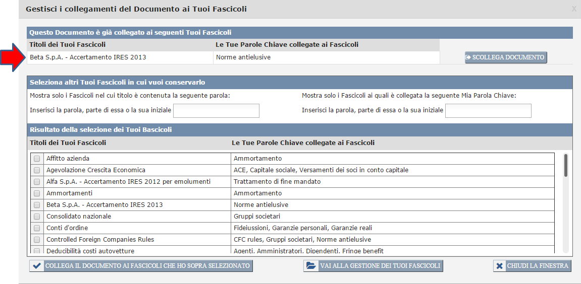 Nel momento in cui colleghi il documento ad un Tuo Fascicolo, l'avvenuto collegamento Ti verrà immediatamente segnalato nella sezione "Questo Documento è già collegato ai seguenti Tuoi Fascicoli" della medesima finestra.