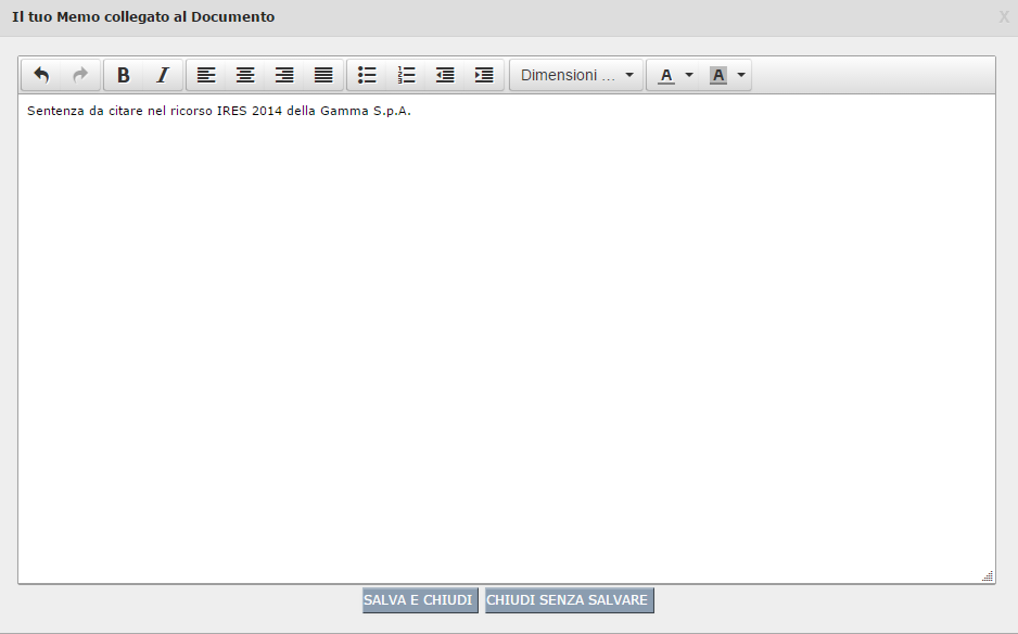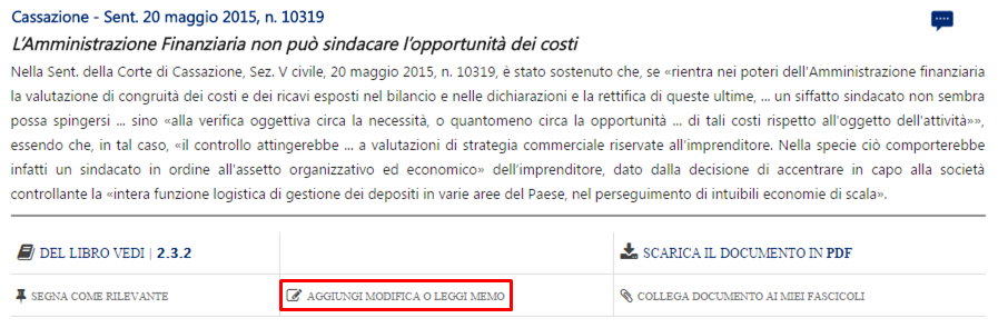 Ad ogni Documento (legge, sentenza , circolare, ecc.) della pagina News e Documentazione puoi aggiungere un Memo, al fine di prendere nota di Tuoi richiami e osservazioni.