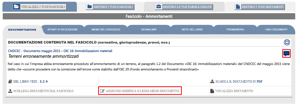 Se il Documento al quale hai aggiunto un Memo viene da Te collegato ad un Tuo Fascicolo, il Memo in questione lo puoi leggere e modificare anche in fase di visualizzazione del contenuto del Fascicolo (vedi Come ricercare e visionare i Tuoi Fascicoli).