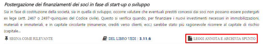 A tal fine, una volta individuato lo Spunto di riflessione al quale vuoi aggiungere un Memo, clicca sul corrispondente pulsante "Leggi annota e archivia Spunto".