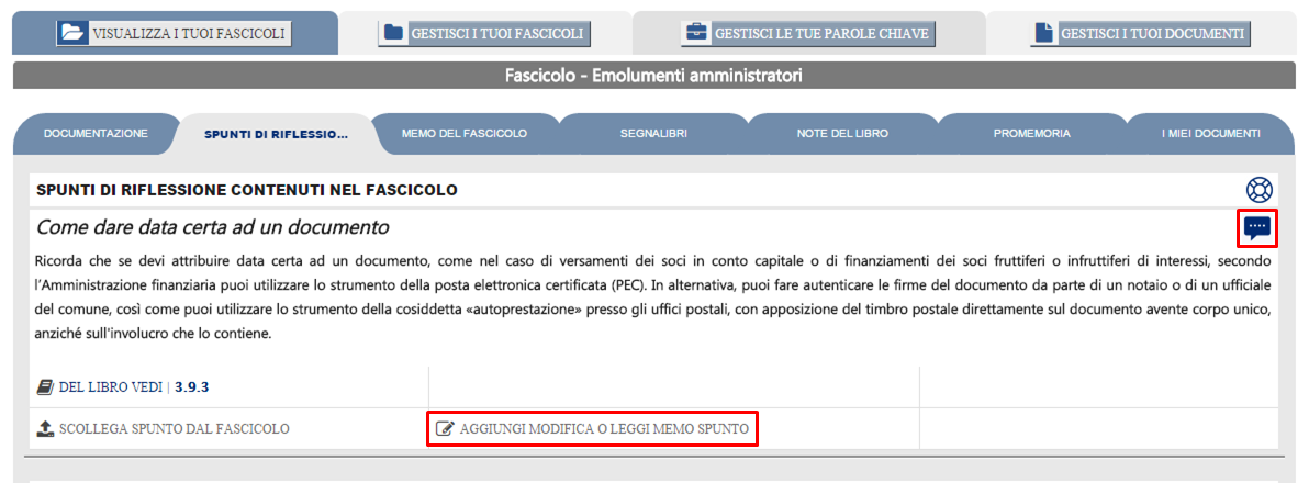 Se lo Spunto di riflessione al quale hai aggiunto un Memo viene da Te collegato ad un Tuo Fascicolo, il Memo in questione lo puoi leggere e modificare anche in fase di visualizzazione del contenuto del Fascicolo (vedi Come ricercare e visionare i Tuoi Fascicoli).
