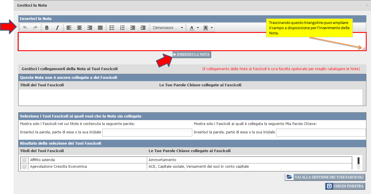 Arrivati a questo punto, se non vuoi collegare la Nota ad uno o più specifici Tuoi Fascicoli, semplicemente clicca sul pulsante "Chiudi finestra". In ogni caso, il collegamento della Nota ad uno o più Fascicoli sarà sempre possibile in un momento successivo, cliccando sull'icona della Nota come inserita all'interno del testo.