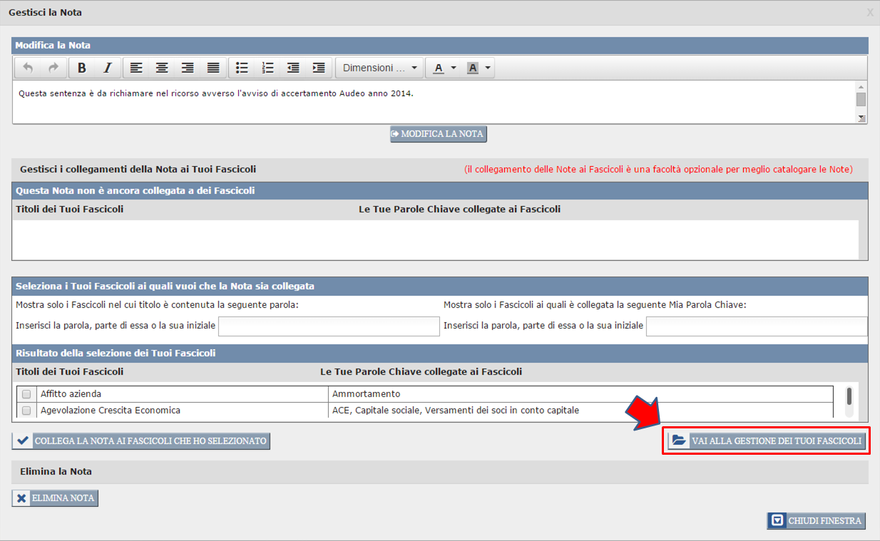 Nel caso Tu voglia collegare la Nota ad altri Tuoi Fascicoli, ripeti la procedura. Finito di collegare la Nota ai Tuoi Fascicoli, clicca sul pulsante "Chiudi finestra".