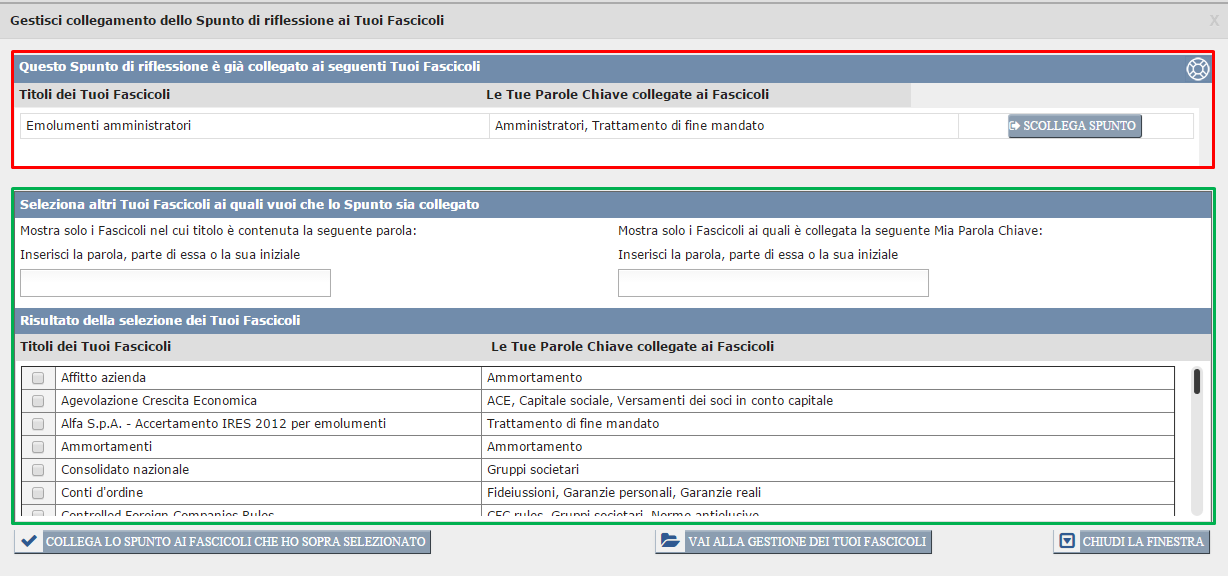 nella seconda parte, qui contornata in verde, hai la possibilità di selezionare il o i Fascicoli ai quali vuoi collegare lo Spunto in questione.