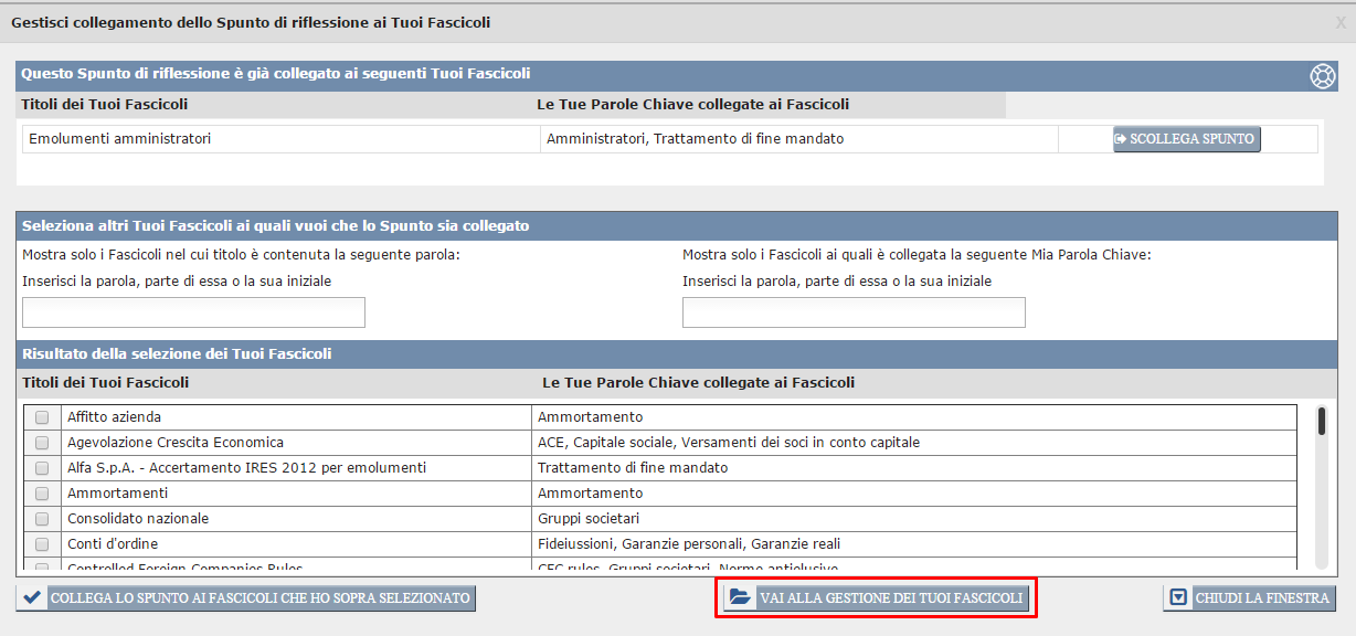 Nel caso Tu voglia collegare lo Spunto di riflessione ad altri Tuoi Fascicoli, ripeti la procedura. Finito di collegare lo Spunto di riflessione ai Tuoi Fascicoli, clicca sul pulsante "Chiudi la finestra".