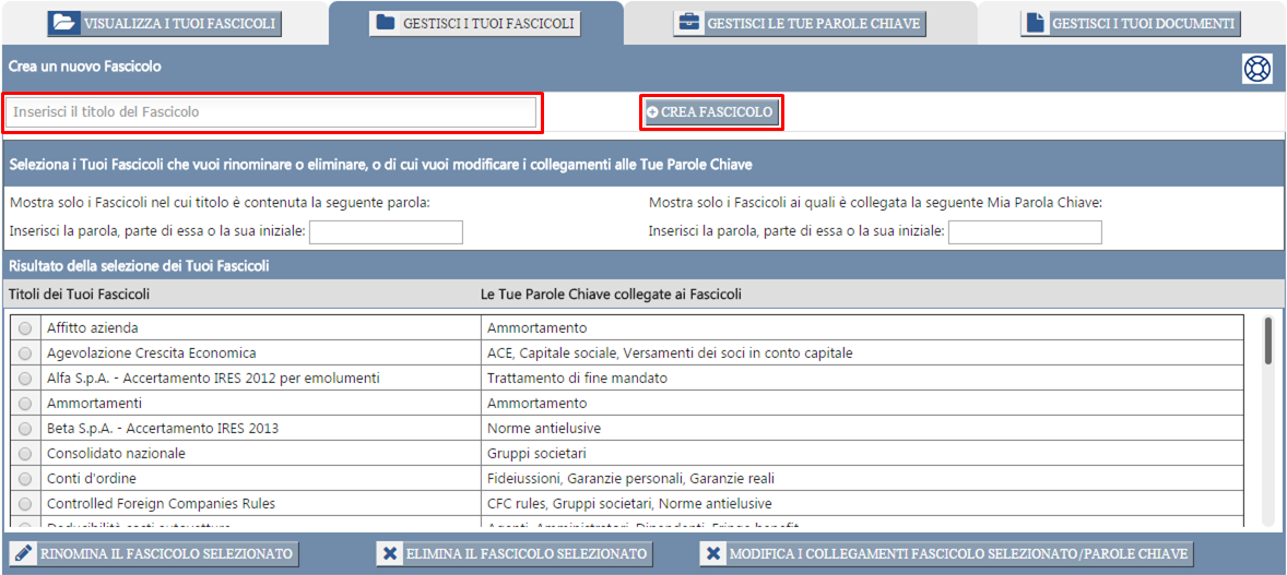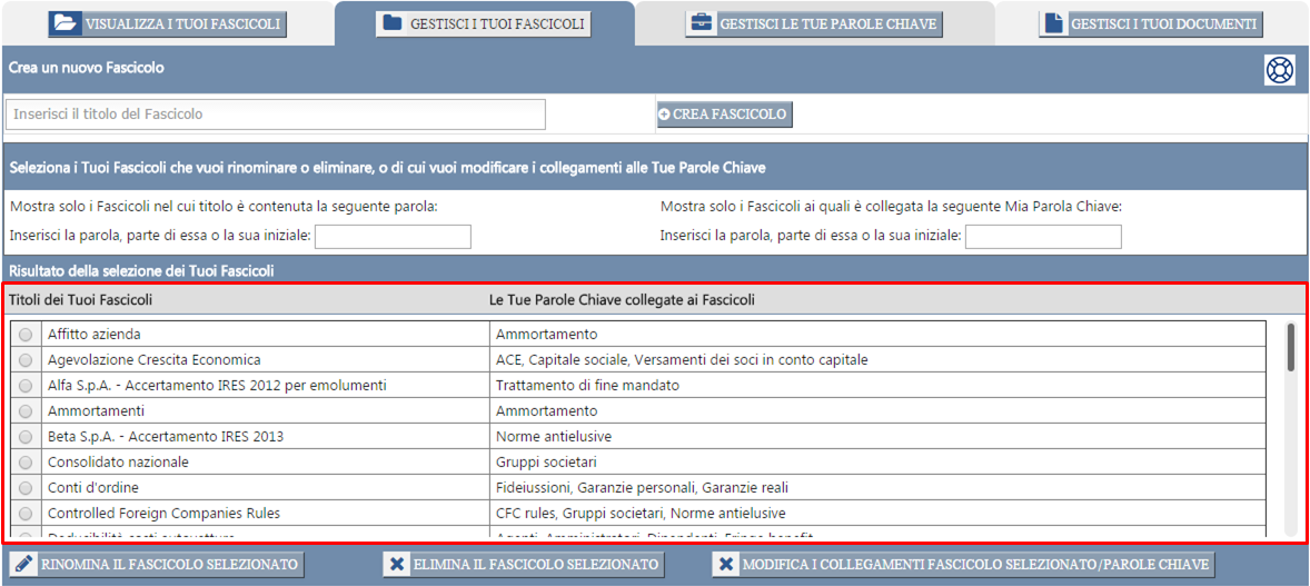 Una volta terminata la procedura di collegamento del Fascicolo alle Tue Parole Chiave, il Fascicolo da Te così creato Ti sarà mostrato nell'area qui sotto contornata in rosso, insieme agli altri Tuoi Fascicoli già esistenti.