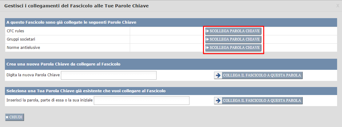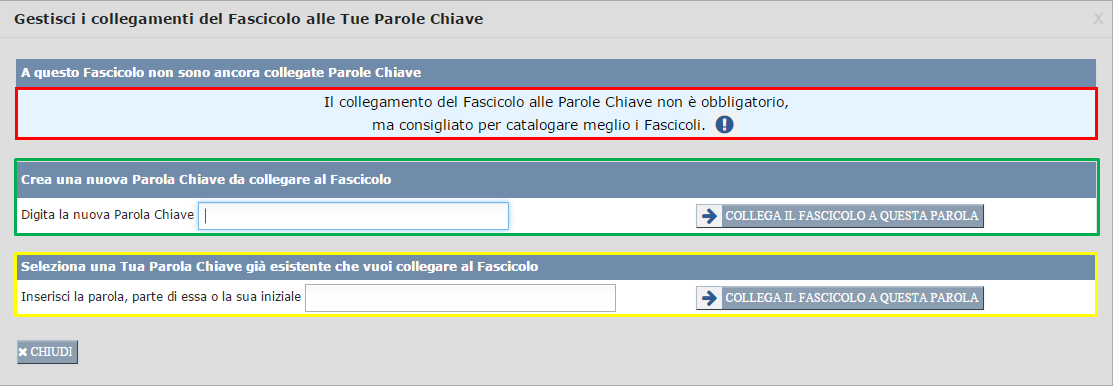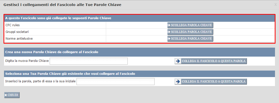 Puoi collegare il Fascicolo a quante Parole Chiave desideri (fino a quando non clicchi sul pulsante "Chiudi" della finestra in questione). Man mano che colleghi il Fascicolo a Tue Parole Chiave, queste Ti saranno mostrate nell'area qui sotto contornata in rosso.