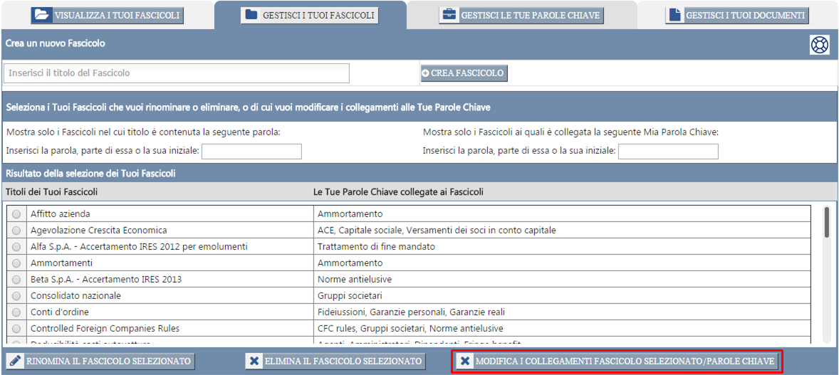 modificare o eliminare i collegamenti del Fascicolo alle Tue Parole Chiave;