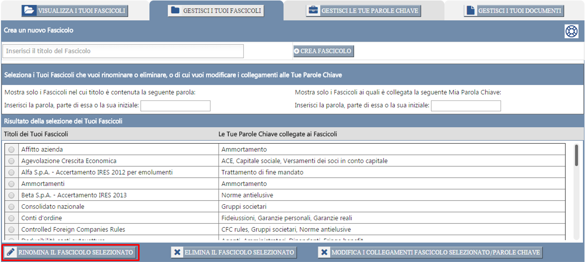 Procedura di selezione dei Fascicoli), clicca sul pulsante "Rinomina il Fascicolo selezionato".