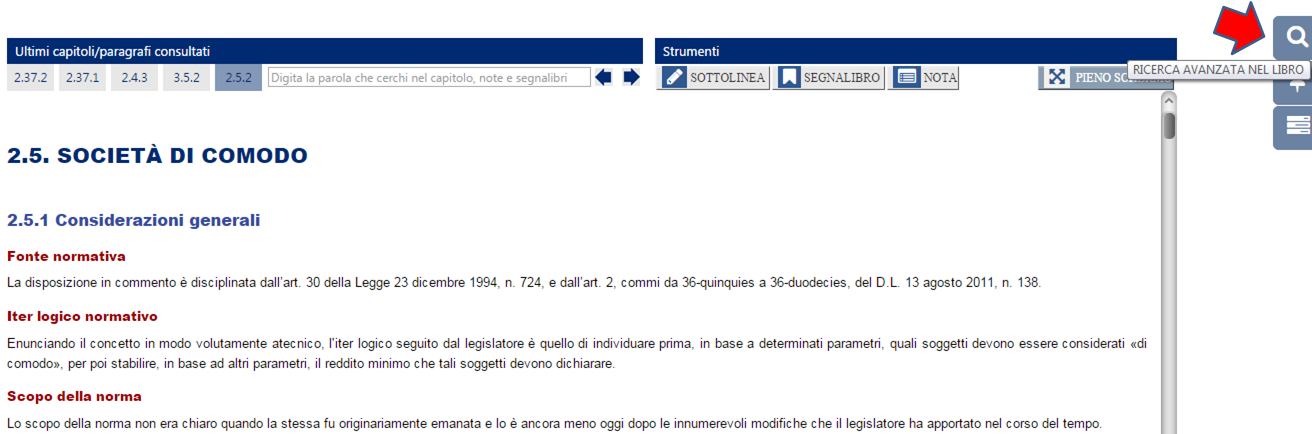 Per cercare un argomento di Tuo interesse nell'intero libro (per la ricerca veloce all'interno di uno specifico capitolo vedi Come fare le ricerche nel capitolo in lettura) esiste un potente motore di ricerca al quale accedi cliccando sul pulsante sulla destra "Ricerca avanzata nel libro".