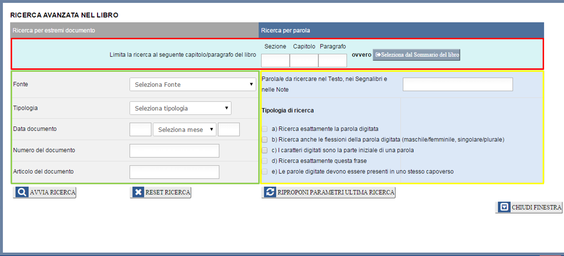 ma potrai anche limitare la ricerca ad una determinata Sezione o ad un determinato capitolo/paragrafo del libro (area qui sotto contornata in rosso).