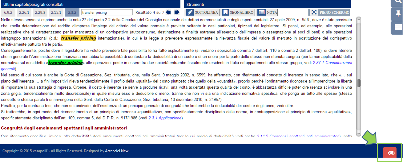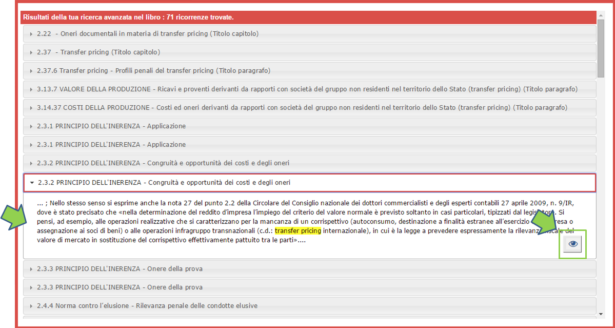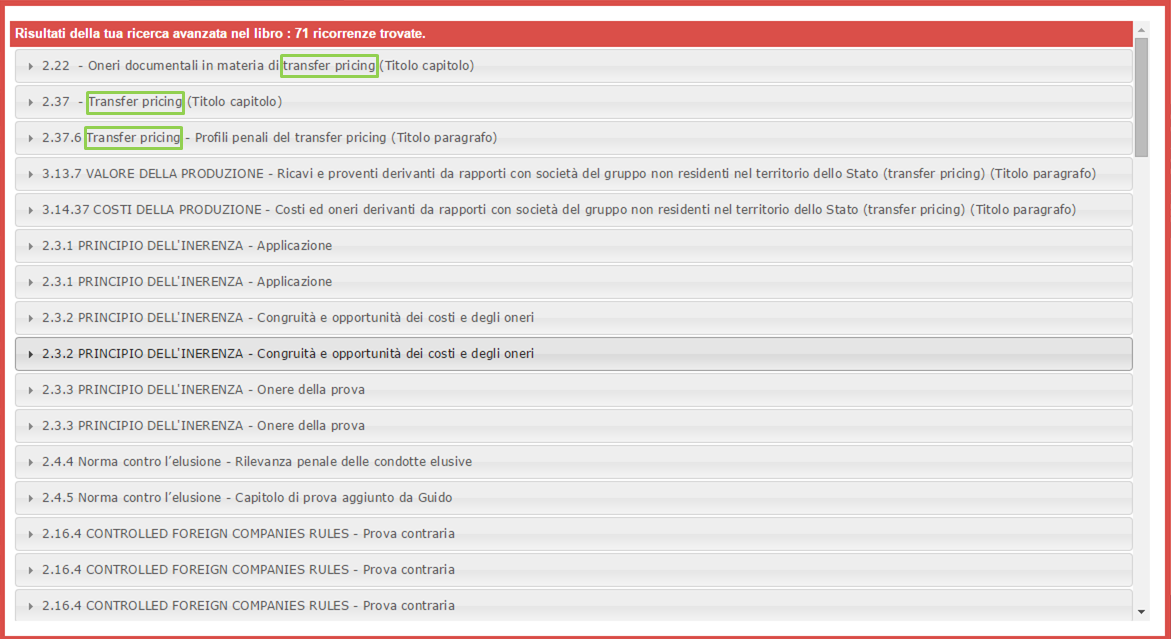 Ad esempio, come puoi vedere nella raffigurazione sotto riportata, ricercando le parole "transfer pricing" le prime tre ricorrenze trovate riguardano capitoli/paragrafi nel cui stesso titolo sono incluse le parole "transfer pricing".