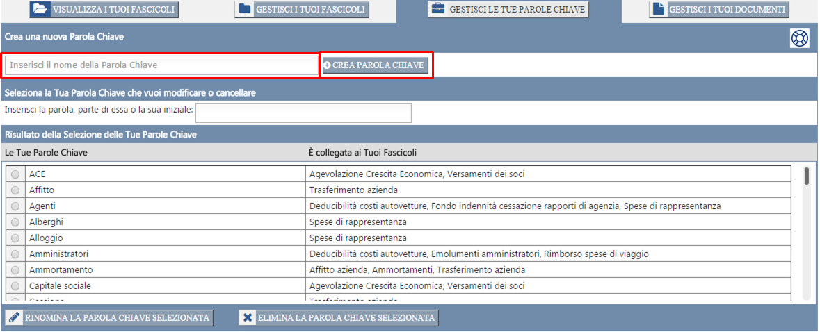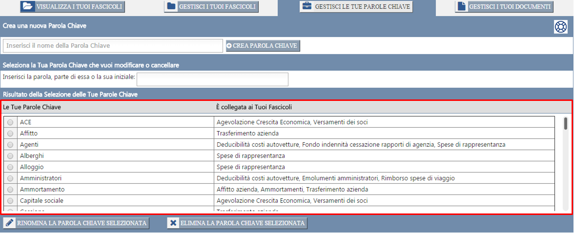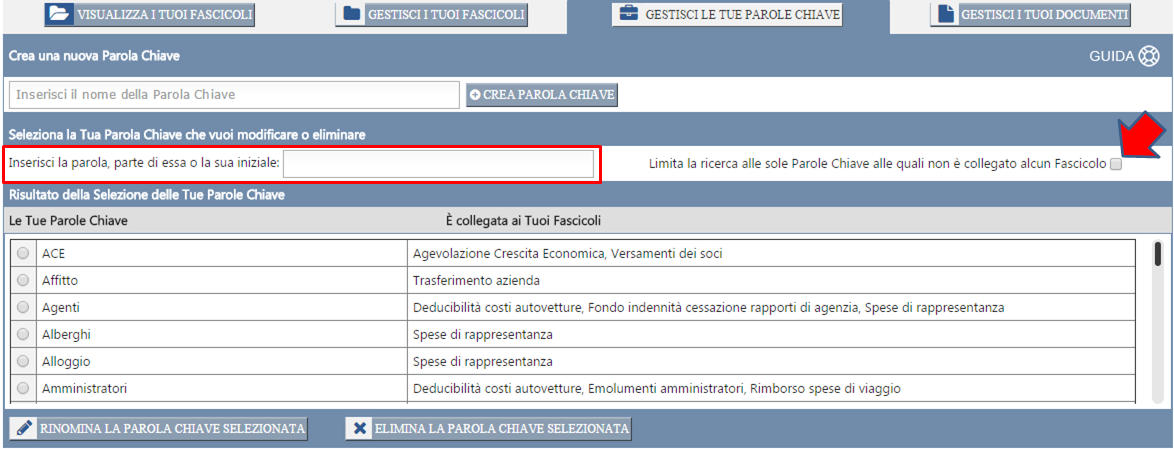 Collegando i Fascicoli alle Tue Parole Chiave, inoltre, potrai ritrovare i Fascicoli più facilmente attraverso la funzione di "ricerca per Parola Chiave" (vedi Procedura di selezione dei Fascicoli).