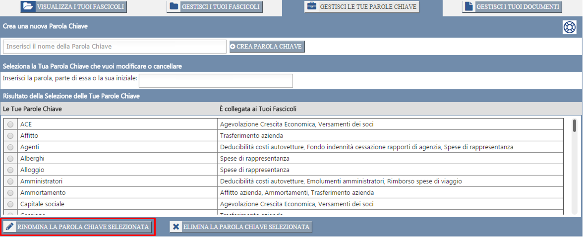 A tal fine vai nella pagina "I Miei Fascicoli" e poi nella sezione "Gestisci le Tue Parole Chiave". Dopo aver selezionato la Parola Chiave di cui vuoi modificare il nome (seguendo la procedura prima esposta), clicca sul pulsante "Rinomina la Parola Chiave selezionata".