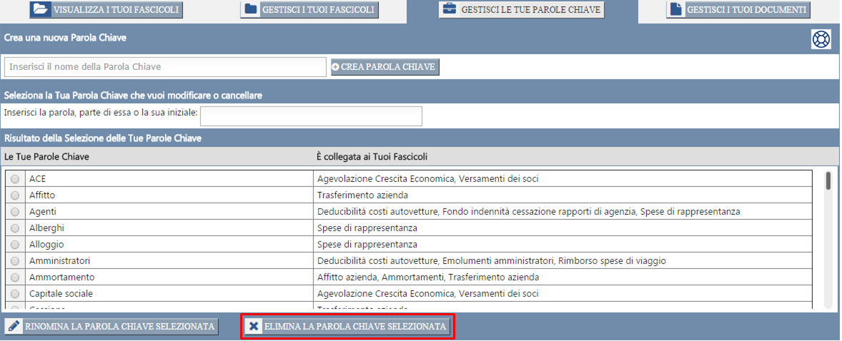 Se desideri eliminare una Parola Chiave, vai nella pagina "I Miei Fascicoli" e poi nella sezione "Gestisci le Tue Parole Chiave". Dopo aver selezionato la Parola Chiave che vuoi eliminare (seguendo la procedura prima esposta), clicca sul pulsante "Elimina la Parola Chiave selezionata".