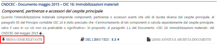 Se ritieni che un Documento (legge, sentenza , circolare, ecc.) della pagina News e Documentazione sia per Te rilevante, ma in quel momento non hai tempo per leggerlo e personalizzarlo (aggiungerci un Memo con le Tue osservazioni, collegarlo ad un Tuo Fascicolo, ecc.), puoi marcarlo come per Te rilevante andando a cliccare sul corrispondente pulsante "Segna come rilevante".