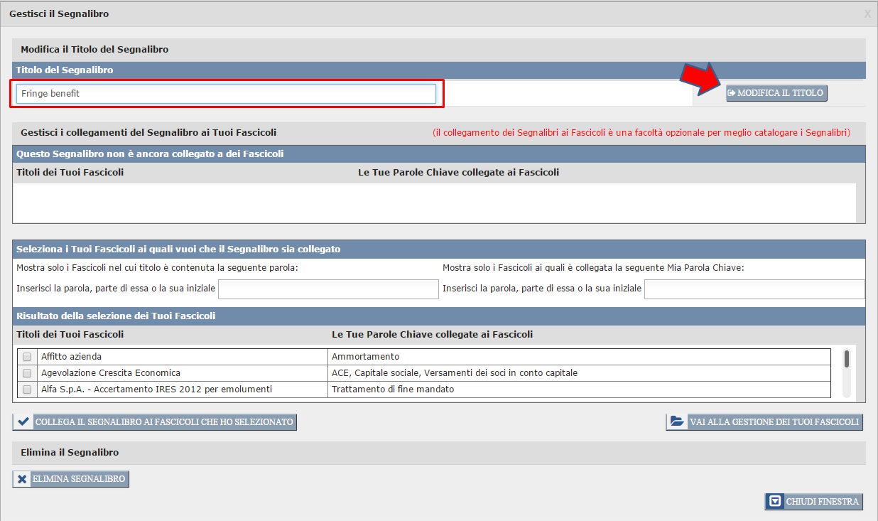 Il collegamento del Segnalibro ad uno o più Fascicoli può anche avvenire in fase di modifica del Segnalibro. Semplicemente clicca sul Segnalibro in questione e segui la stessa procedura descritta al paragrafo