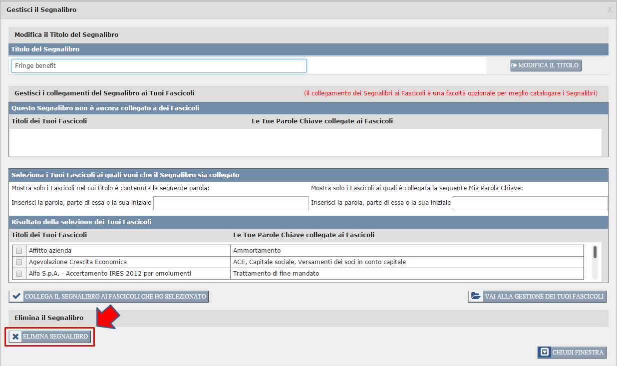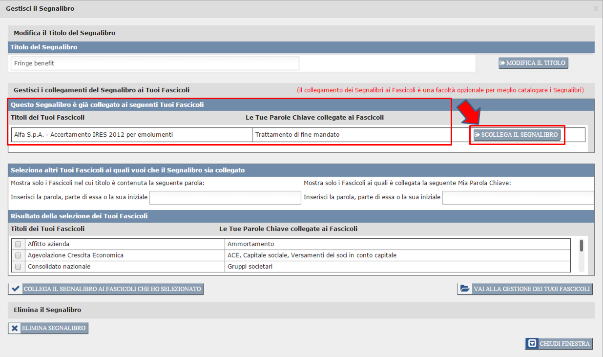 Per scollegare il Segnalibro da uno o più Fascicoli ai quali lo stesso è stato da Te precedentemente collegato, clicca, innanzitutto, sul Segnalibro in questione. In corrispondenza del titolo del Fascicolo dal quale vuoi scollegare il Segnalibro, clicca sul pulsante "Scollega il Segnalibro".