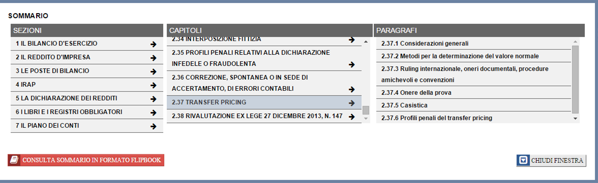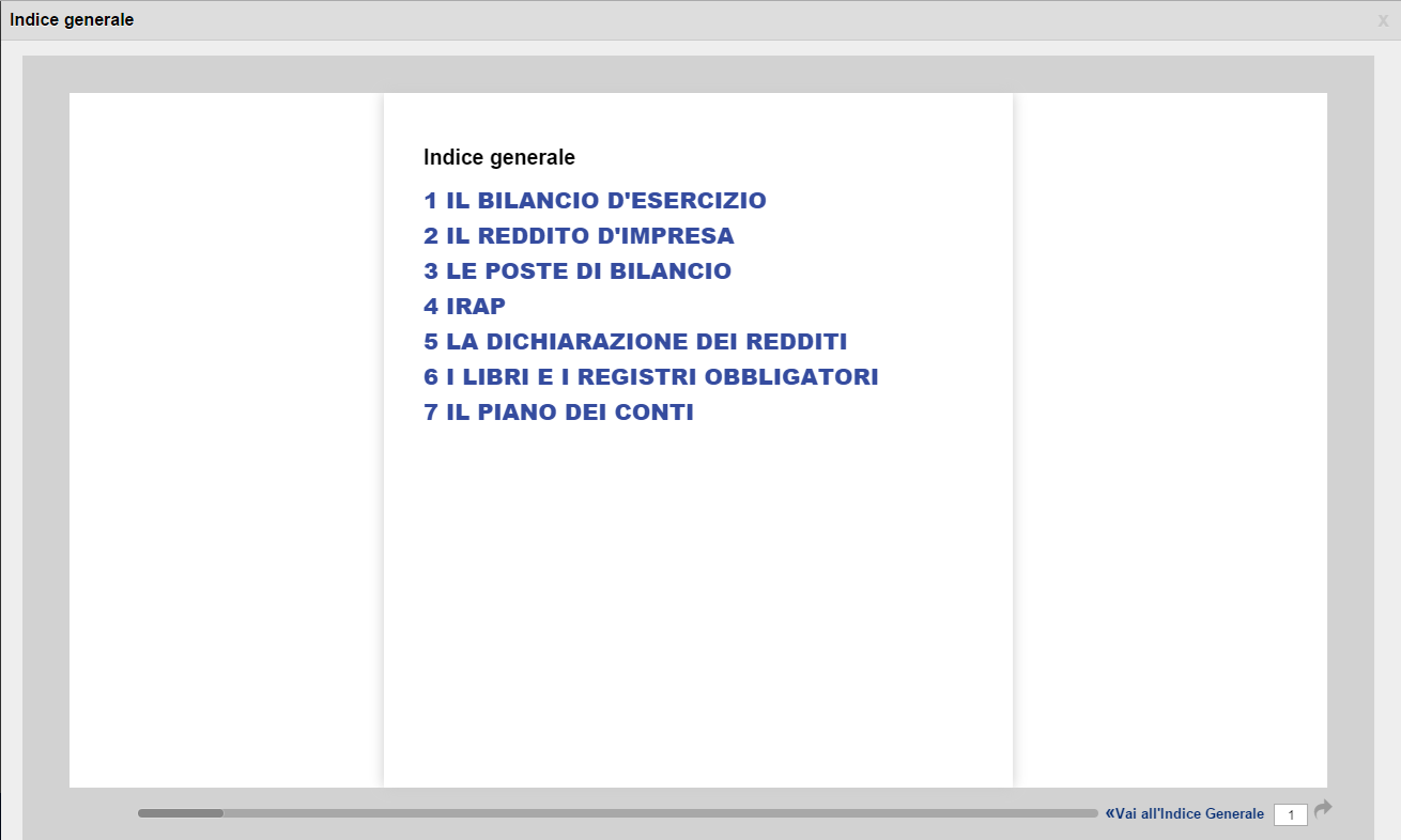 Si aprirà Il Sommario del libro, attraverso il quale potrai selezionare il capitolo o il paragrafo che, di Tuo interesse, desideri visualizzare. Passando con il puntatore del mouse sopra la sezione del libro di Tuo interesse si aprirà la finestra contenente la lista dei capitoli inclusi in quella sezione. Passando, poi, con il puntatore del mouse sopra il capitolo di Tuo interesse, si aprirà la finestra contenente la lista dei paragrafi inclusi in quel capitolo.