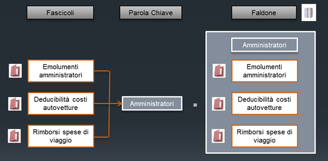 e li collegassi alla medesima Parola Chiave "Amministratori", è come se Tu avessi raccolto i tre Fascicoli in questione in un Faldone dal titolo "Amministratori", come raffigurato qui sotto.