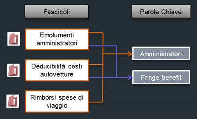Ad esempio, proseguendo l'esemplificazione prima fatta, se i Tuoi Fascicoli "Emolumenti amministratori" e "Deducibilità costi autovetture" li collegassi, oltre alla Parola Chiave "Amministratori", anche alla Parola Chiave "Fringe Benefit",