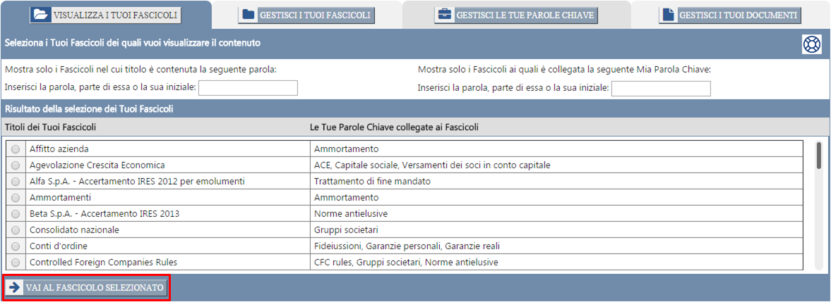 Una volta selezionato il Fascicolo di cui vuoi vedere il contenuto, clicca sul pulsante "Vai al Fascicolo selezionato".