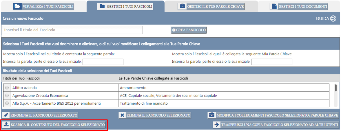 Gestisci i Tuoi Fascicoli". Una volta selezionato il Fascicolo il cui contenuto vuoi salvare nel Tuo disco fisso (seguendo la "comune" procedura per selezionare un Fascicolo - vedi