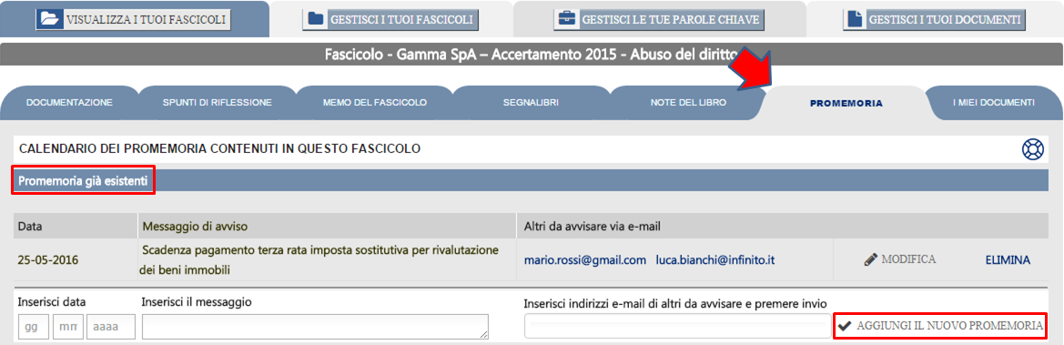 Nella sezione Promemoria hai la possibilità di aggiungere, modificare e leggere i Promemoria del Fascicolo. Per ciascun Fascicolo, infatti, hai la possibilità di collegare uno o più Promemoria che Ti avvertano a tempo debito di scadenze collegate alla pratica correlata al Fascicolo. Non solo un'apposita e-mail inviata al Tuo indirizzo di posta elettronica Ti avviserà dell'avvenuta scadenza del Promemoria, ma hai anche la possibilità di fare pervenire lo stesso Promemoria all’indirizzo e-mail di altri Tuoi collaboratori o di Tuoi clienti.