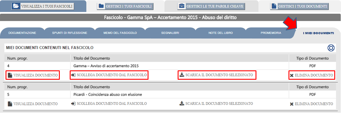 Nella sezione I Miei documenti trovi i Tuoi documenti che hai collegato al Fascicolo in questione dalla pagina I Miei Fascicoli, sezione"Gestisci i Tuoi documenti" (vedi Come aggiungere dei Tuoi documenti).