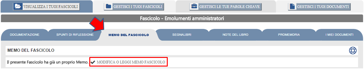 Nella sezione Memo del Fascicolo hai la possibilità di aggiungere, modificare e leggere il Memo del Fascicolo. Per ciascun Fascicolo, infatti, hai la possibilità di scrivere un Memo nel quale raccogliere i Tuoi appunti, le Tue riflessioni e le Tue idee con riferimento alla tematica affrontata nel Fascicolo o alla pratica di lavoro che esso rappresenta.